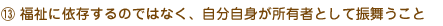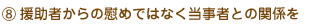 | 当事者が周囲からの援助に依存している場合は、周囲が何でも世話をやいて、本人は「利用してやるか」というような態度をとってしまう。当事者が主体性をもって生活していくことを目指す。 |