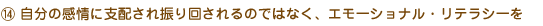 | 自分の感情に支配され振り回される時は、自分の本当の感情を隠し、自分が欲しい物を手に入れるために人を操作したりしてしまう。このような感情に支配される状態から、自分の感情をありのまま受け止め、表現する力であるエモーショナル・リテラシーを目指すことで、自分の感情を体験し、自分の行為に対して反省の念を感じ、行動を変化させていくことができる。 |
