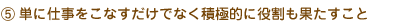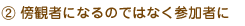 | 最初は自ら主体的に行動していくことは難しく「退屈だ、関係無い」と感じることが多い。そんな時こそ自分が傍観者になっていることを自覚し、自ら主体的に行動しグループに参加していくことを目指す。 |