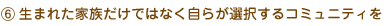 | 不健康な血縁関係に執着しすぎることで、より多くの困難を生じることがある。血縁関係だけに執着するのではなく、新たなコミュニティの中で健康的な人間関係を持つことができるという選択肢をもつことを目指す。人生、学校、職場、遊びの場で新しい関係をもつことができる。 |