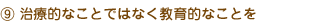 | 当事者の症状ばかりへ着目し治療的なかかわりを目指すのではなく、何を学び成長していくのかに着目し教育的なかかわりを目指す。 |