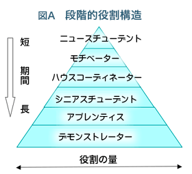 | 連載第5回でも述べたが、図Aのように、デモンストレーターから、ニュースチューデントまで、回復の段階に応じて、一人一人が少しずつ大きな役割を担う構造が設定されている。この「段階性」にはいくつかの目的がある。一つは、従来スタッフのみが担っていた様々な役割を、当事者同士で分担することで、当事者とスタッフの間にある溝を段階的に埋めていくことができる。 |
