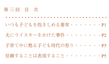 だから、子どもが泣いて来ても、怒って来ても、喜んで来ても、いつも子どもを抱きしめて「よかったねえ」とか、「つらかったねえ」とか、それしか方法がなかったんですけれどね。 |