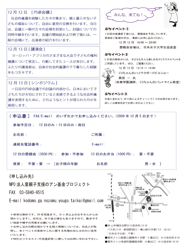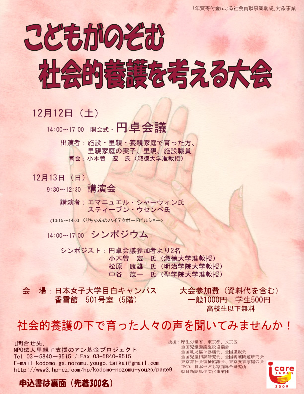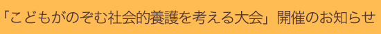 施設養育・里親養育など社会的養護を受けてきた当事者が、自己の意見を発信し他者と意見交換を行い、 当事者のエンパワーメントを行う機会を設定と同時に、児童福祉の課題と改善点に関する施策提言を行うことを目的とする。具体的には、「こどもがのぞむ社会的養護を考える大会」を開催し、以下のプログラムを実施する。(大会期間は連続2日間、参加者は各日とも200名程度を予定) 1日目 里親・施設養育を受けた当事者および関係者による円卓会議を行う。 2日目 1日目の会議で出された児童福祉の課題について話し合うために、2名の方の招待講演をおこなう。また、各領域の実践家・専門家および当事者によるシンポウムを開催する。