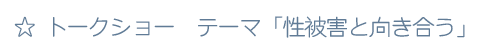 | 映画の上映後、監督の小野さやかさんとのトークショーは、ゲストに、『性犯罪被害にあうということ』の著者の小林美佳さんを迎えて行われました。小林さんは、性犯罪被害にあったことを実名で公表して、多くのメディアに多く取り上げられて話題になりました。現在は、仕事をしながら、被害者支援活動しています。司会は、子ども虐待防止のオレンジリボンネット管理・編集人の箱崎幸恵さんが務めました。 |