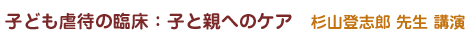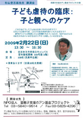 発達障害のある子どもや虐待を受けた子どもの治療を行っている、 あいち小児保健医療総合センター心療科部長兼保健センター長、 杉山登志郎先生を招いて、「子ども虐待の臨床:子と親へのケア」と題した