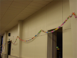当日、受付には長蛇の列ができ、多くの人が関心を寄せてくださっていることをうれしく思いました。開会式の折り紙入場セレモニーの様子をご覧ください。いろいろな事情から本大会には参加できないけれども、趣旨に賛同し違うかたちで参加してくれた子どもたちがいました。思いをこめて名前や絵を描いてくれた折り紙の短冊は全国から集まり、長い長いチェーンとなって、2日間会場を飾りました。