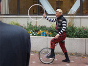 もうひとりの大柄で笑顔が素敵なエマニュエル・シャーウィンさんは、IFCOにユース部門をつくった行動的な方です。児童養護施設時代から、仲間を募り大人たちを巻き込んで、例えば門限や小遣いといったことからルールを変えたり、変化を起こしてきました。以来国際的に子どもの人権やケア向上のために活動する彼は、日本も社会全体が子どもの権利を理解し、様々な学術関係者、実践者、職種の人々が集まって力をあわせることの必要を述べました。 そして、紙とペンを用意し、自分にできることを書きだして実行してみてほしいとヒントをくれました。 盛り上がった午前の部のあとのランチブレイクでは、イベントもありました。華麗な一輪車の輪くぐりやパフォーマンスに、寒い戸外もぽっと温まったようでした。 午後は、1日目の円卓会議者のうち3人の当事者の方と司会をされた先生、それから新たにお2人の先生を加えた6人と大会実行委員長の和泉広恵さんにより、シンポジウムが行われました。実子を含めた里親養育、やむをえず社会的養護が必要になった子どもには選択肢を示すことなど、関心を集めました。 ほかにも、関係と時間の積み重ねとしての家族、つながりあうことの大切さや、養育者が変わらないための職員・里親が長く続けられるようなサポート、など話題はつきませんでした。