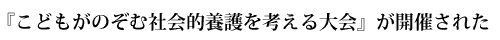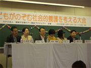 | 2009年12月12、13日と2日間にわたって、NPO法人里親子支援のアン基金プロジェクト主催により、『こどもがのぞむ社会的養護を考える大会』が日本女子大学の目白キャンパス内にて開催されました。 この大会の最も大きな目的は、「子どもが大切にされていると実感できる社会の実現」でした。これまで社会的養護のもとで育たざるを得なかった子どもたちは、施設は施設、里子は里子というように、ばらばらに捉えられてきたようです。しかし、どこにいる子どもであっても「自分は大事にされている」と思える環境が必要なことは言うまでもありません。そこでこの大会をひとつの出発点として、まず垣根なく当事者である子どもたちのことばに耳を傾け、子どもたち自身も私たちもみんなでこれからのことを考えたい、という思いでスタートしました。
